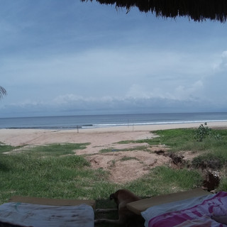 Aber jetzt wollten wir erstmal ins Meer! Die Wellen rauschten und das Meer ähnelte einer riesigen Badewanne, mit soviel Schaum! Es war herrlich! Der Strand gehörte nur uns! Während des ganzen Urlaubs haben wir kaum andere "Weiße" gesehen. Wir legten uns an der Strandbar auf ein paar Liegen und blickten auf das Meer hinaus. In der Ferne waren sogar Delfine zu erkennen! Neben uns machte es sich ein Wildhund und eine kleine weiße Katze gemütlich.